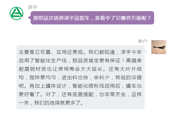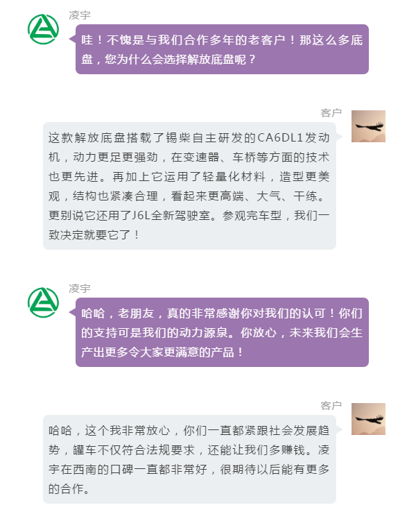哈哈,這個(gè)我非常放心,你們一直都緊跟社會(huì)發(fā)展趨勢(shì),罐車不僅符合法規(guī)要求,還能讓我們多賺錢。凌宇在西南的口碑一直都非常好,很期待以后能有更多的合作。