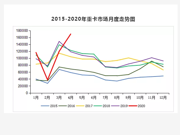 受疫情影響,2020年前四個(gè)月的重卡市場,整體比較坎坷,呈現(xiàn)出V形走勢曲線。雖然1月份銷量創(chuàng)下歷史新高,同比增長18.2%,取得了開門紅,但2、3月份市場連續(xù)出現(xiàn)大跌,分別同比下滑51.8%、19.3%;直到4月份,隨著新冠肺炎疫情對國內(nèi)經(jīng)濟(jì)的影響逐漸消退,市場才重回上升趨勢,并且呈現(xiàn)出產(chǎn)銷兩旺的發(fā)展勢頭。