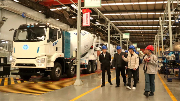 在停車場,一排排解放新能源攪拌車整齊列陣,氣宇軒昂,仿佛等待檢閱的將士,引得來訪貴客們交口稱贊。參觀結(jié)束后,裴總一行對中集車輛與一汽解放近年來的合作成果給予高度評價,對未來合作充滿信心。了解到中集車輛攪拌車業(yè)務集團洛陽基地1960年建廠,與1953年成立的解放僅相差7年,裴總感慨道,二者都是同一個時代的驕傲!
